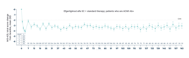 AChR-Ab+: acetylcholine receptor antibody-positive; CMI: clinically meaningful improvement; MG-ADL: myasthenia gravis activities of daily living; SC: subcutaneous; SD: standard deviation; SE: standard error; TEAE: treatment