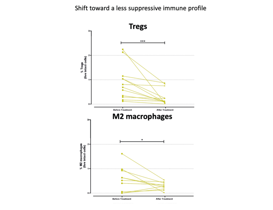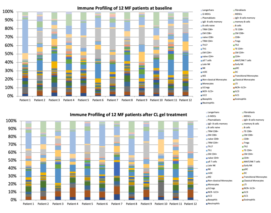 Immune profiling carried out in the 12 patients with MF before and after CL-gel treatment revealed distinct immuneprofiles. Notably, there was a shift towards a less immunosuppressive TME profile following treatment, as evidenced by significant reductions in Tregs and M2 macrophages (Figure 2).