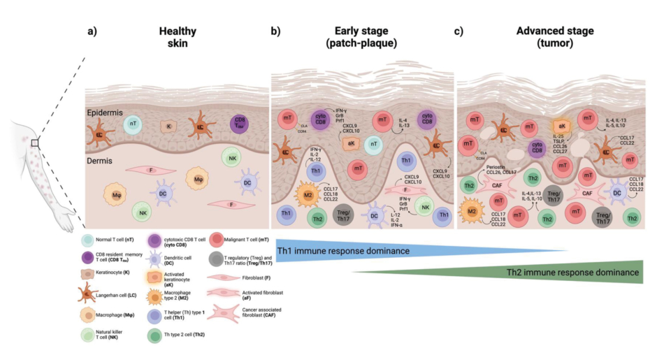 aF: activated fibroblast; aK: activated keratinocyte; CAF: cancer associated fibroblast; CCL: chemokine ligand; CCR4: C-C chemokine receptor 4; CD8: cluster of differentiation 8; CD8 TRM: CD8 resident memory T cell; Cyto CD8: cytotoxic T cell; CLA: cutaneous lymphocyte antigen; CXCL: chemokine; DC: dendritic cell; F: fibroblast; K: keratinocyte; GrB: granzyme B; IFN: interferon; LC: Langerhan cell; M: macrophage; M2, macrophage Type 2; mT: malignant T cell; NK: natural killer T cell; nT: normal T cell; Prf: perforin; Treg/Th17: T regulatory and Th17 ratio.