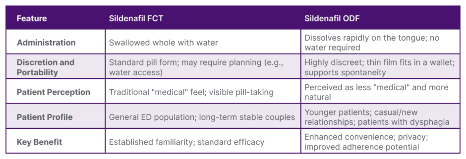 Head-to-head and observational data show that sildenafil ODF is non-inferior in efficacy to conventional tablets, with advantages in convenience and discretion.21,27,28 In particular, Ward explained that ODF formulations may be preferable when the patient has swallowing difficulties or aversion to tablets, discretion is important, or a more “on-the-go” format is desired.