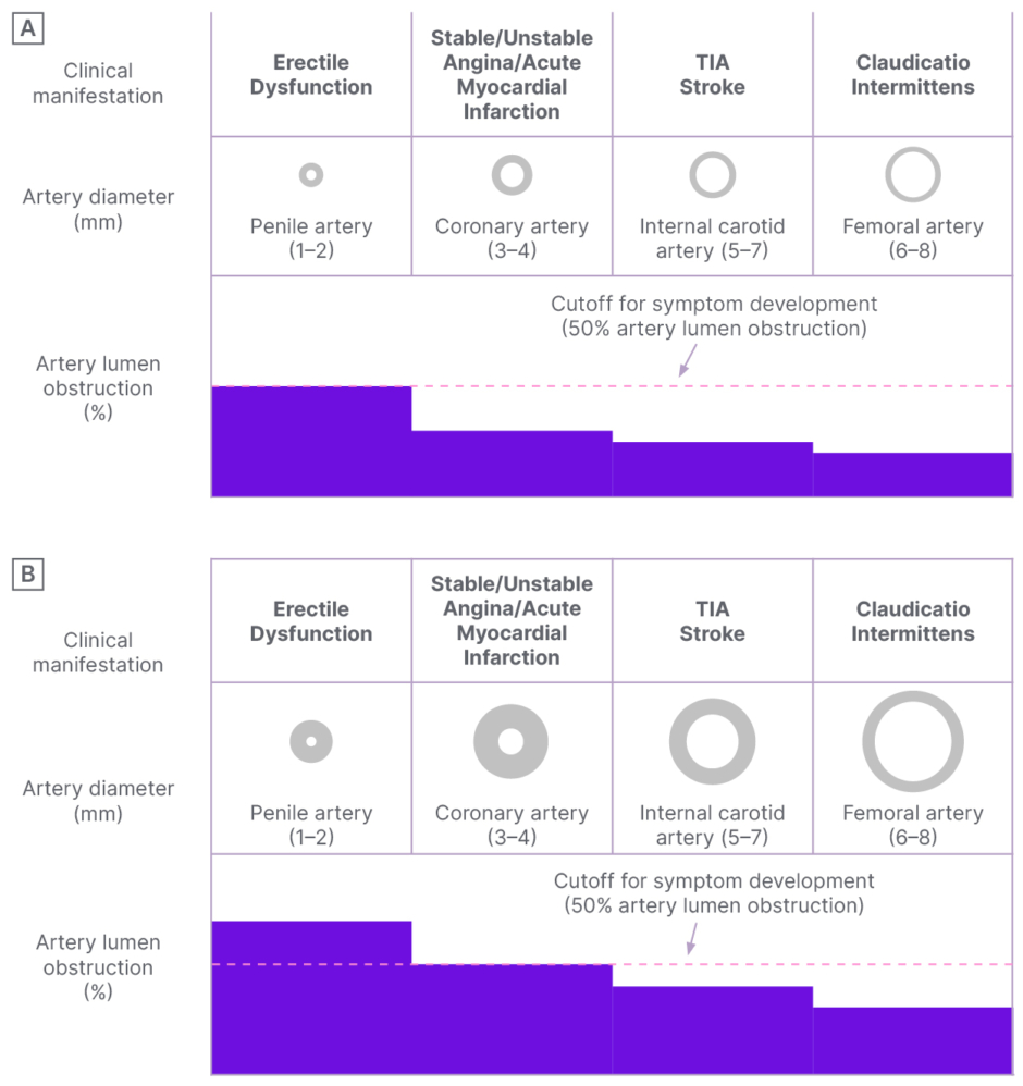 A) Early stage of the atherosclerotic process. Significant vascular obstruction (>50% lumen artery narrowing) of penile circulation leading to erectile dysfunction symptoms is shown. B) Late stage of the atherosclerotic process. Significant vascular obstruction of coronary circulation leading to angina pectoris is shown.