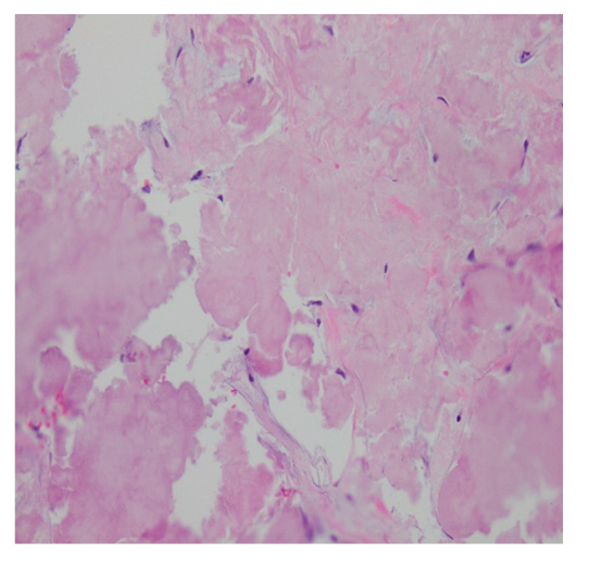 Figure 2: Biopsy showing proteinaceous material with no evidence of neoplastic plasma cells.