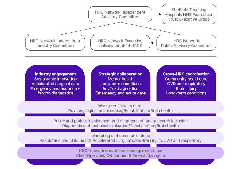 Challenges across the HealthTech landscape are well-documented, persistent, and particularly affect small businesses. These include a fragmented infrastructure, complex regulatory pathways, and unclear routes to NHS adoption. The federated approach of the HRC Network attempts to redress these. This structure allows individual HRCs to maintain their clinical autonomy and unique identities while operating under coordinated governance and shared strategic functions. Led by experts within HRCs, strategic and cross-cutting functions aim to unite and leverage the expertise, impact, and influence of 14 HRCs, fostering collaboration, knowledge exchange, and influencing the processes and policies that govern HealthTech development, regulation, and adoption.