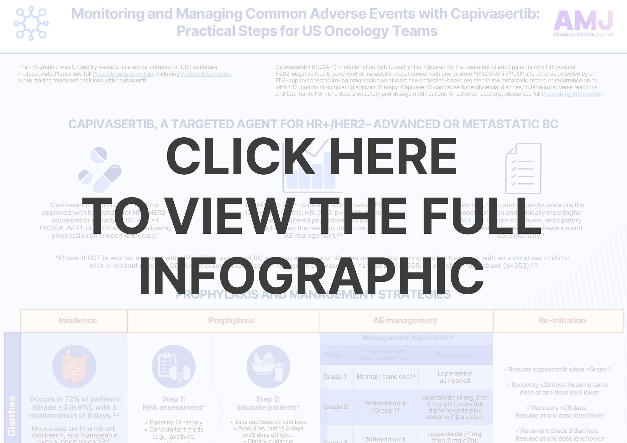 Diarrhea, rash, and hyperglycemia are the most common and clinically meaningful adverse events (AE) with capivasertib and require structured, anticipatory management to maintain adherence and dose intensity. This infographic outlines practical steps for US oncology teams, including prophylaxis and management strategies, AE management, and re-initiation considerations.