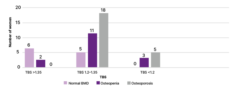 Among the 11 women with normal BMD, illustrated by pink in Figure 1, who would be labelled as having good bone health, only 6/11 (54.5%) had good microarchitecture, and the other 5/11 (45.5%) had a TBS of 1.2–1.35. None had a TBS <1.2. In 16 women with osteopenia,, illustrated by purple in Figure 1, three, 11, and two women, respectively, had a TBS <1.2, 1.2–1.35, and >1.35. Thus, 68.7% of women had a TBS of 1.2–1.35, indicating that degradation has started, only 12.5% maintained good architecture and 18% had a TBS <1.2. Among the 23 women who were osteoporotic, illustrated by gray in Figure 1, none had a TBS score of >1.35. Respectively, 18 and five women had a TBS of 1.2–1.35 and <1.2.
