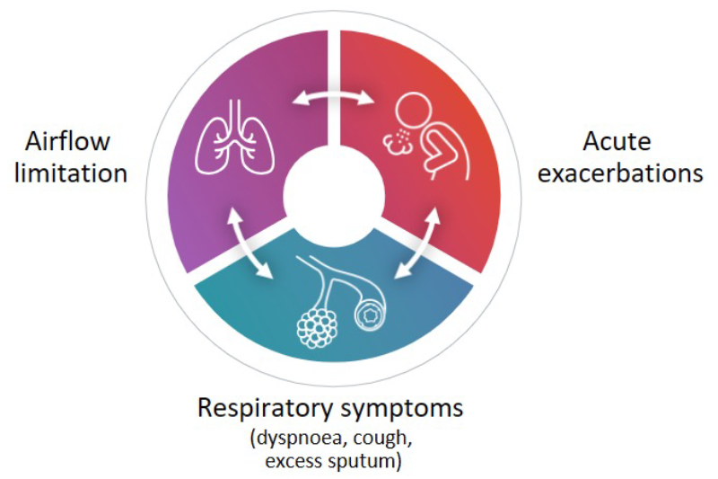 COPD has broad-reaching, substantial negative effects on the health of individuals worldwide. Responsible for 3.5 million deaths in 2021, it is the fourth leading cause of death globally according to the WHO.4 The disease is fundamentally characterised by three interconnected components: 1) persistent airflow limitation; 2) respiratory symptoms; and 3) exacerbations, each of which contributes substantially to patient burden.3 These three components together create a vicious cycle that underpins disease progression (Figure 1).3