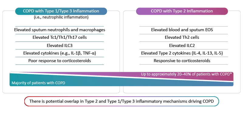 Since the introduction of blood eosinophil count (BEC) as a biomarker for predicting the efficacy of inhaled corticosteroids in preventing COPD exacerbations in 2010, our understanding of the role of inflammation in COPD pathophysiology continues to evolve.3 Whilst there is potential for overlap, Type 1/Type 3 inflammation generally drives disease in the majority of individuals with COPD, and up to about 40% of patients have COPD with Type 2 inflammation (Figure 2).17-19 COPD with Type 2 inflammation is characterised by elevations in blood and sputum eosinophils along with inflammatory cytokines such as IL-4, IL-13, and IL-5.22-23