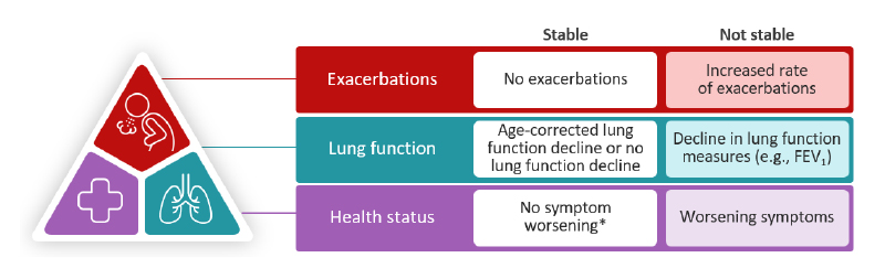 In COPD, disease stability can be conceptualised as a multi-dimensional goal, including no exacerbations, minimal lung function decline, and no worsening of symptoms (Figure 3).52 Singh further clarified this concept, emphasising, “I’m not proposing that we use some literal translation of the word ‘stable’, [or] that patients just remain the same. I’m proposing that we improve patients as much as we possibly can, get them into their optimum state that includes no exacerbations as an indicator of low disease activity, and keep them there as long as possible.”|This framework builds on the GOLD strategy and incorporates measures such as clinical control and clinically important deterioration. Optimising therapy to improve patient outcomes and then maintaining disease stability provides a structured, patient-focused approach.52 The speakers concluded the section by discussing how they frame disease stability as a goal in their discussions with patients, and how they convey the potential opportunities of biologics to achieve stable outcomes.