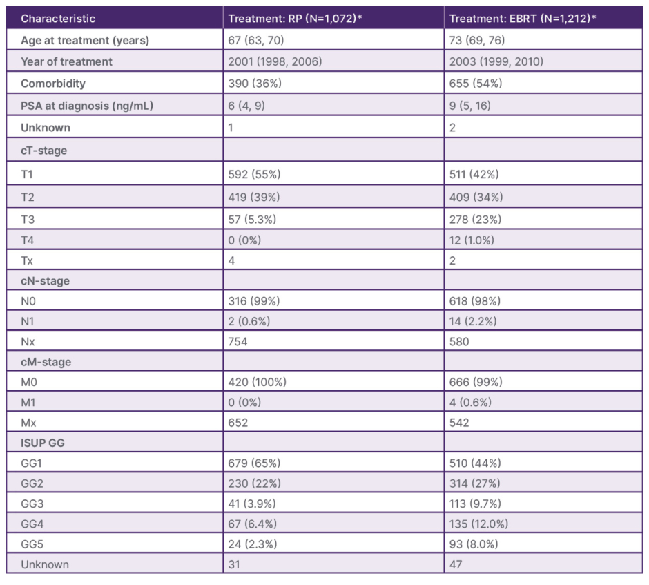 EBRT: external beam radiotherapy; ISUP GG: International Society of Urological Pathology Grade Group; PSA: prostate-specific antigen; RP: radical prostatectomy.